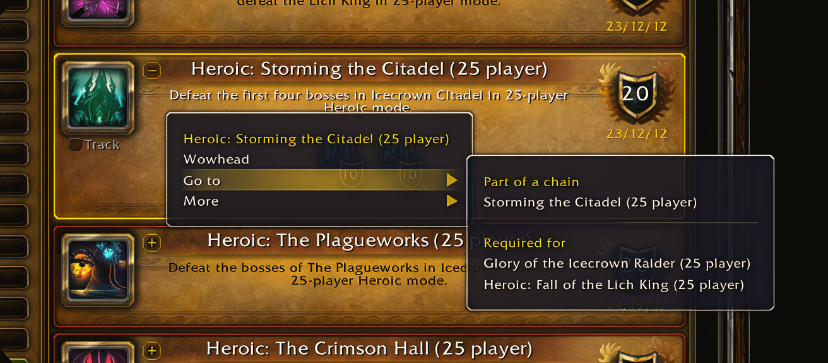 Аддон Overachiever 3.3.5/3.3.5а — расширяет функционал окна достижений, добавляя новые вкладки, предложения и удобный поиск. Он автоматически отслеживает ваши достижения и подсказывает, если поблизости есть объекты, связанные с выполнением целей.