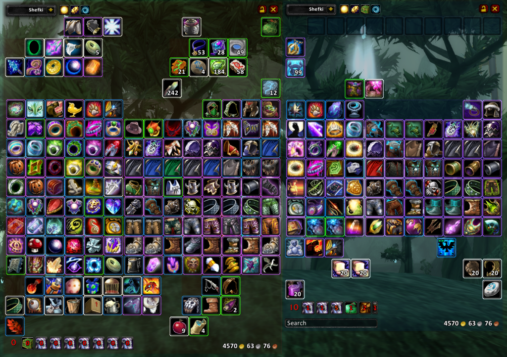 Это позволяет вам в любое время просматривать содержимое сумок и банка ваших персонажей (отсортированное по их торговым навыкам), нажав на выпадающий список имен в правом верхнем углу. Это также позволяет выполнять полный поиск предметов из текстового поля поиска, расположенного слева от выпадающего списка имен.
