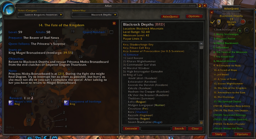 - Интеграция с Atlas: AtlasQuest полностью совместим с картами Атласа и отображает квесты для каждого конкретного подземелья. Для работы этого аддона необходим установленный Atlas;