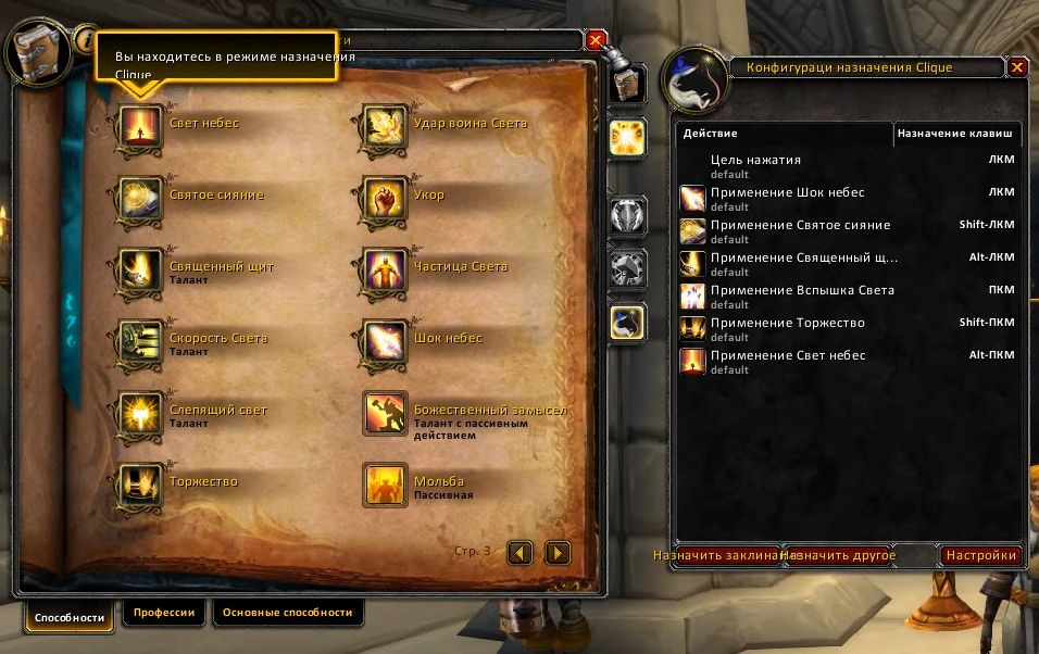 - Лёгкая настройка заклинаний: достаточно назначить скилл на выбранную кнопку, после чего клик по фрейму союзника мгновенно вызовет нужное заклинание — целиться отдельно не нужно;