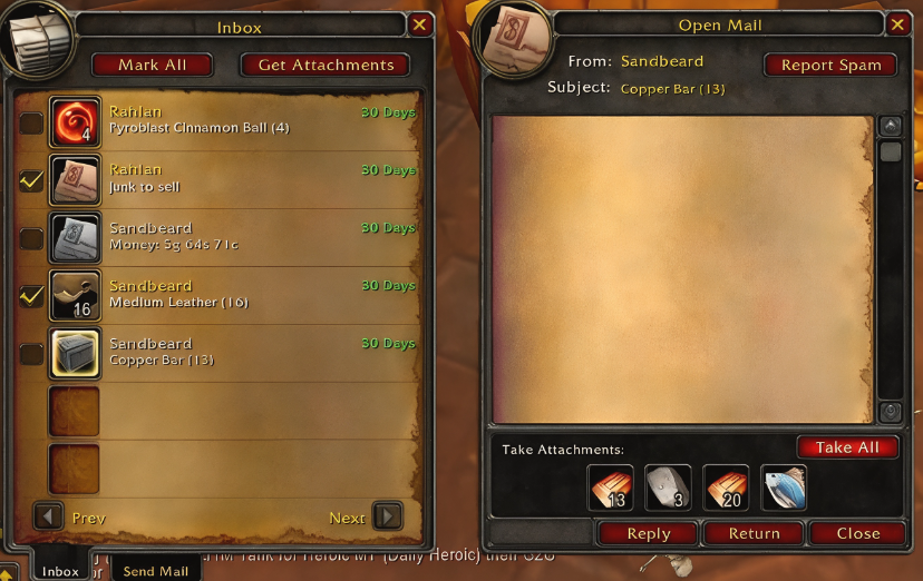 - Массовое получение писем: одна кнопка для быстрой выгрузки всех писем с золотом, предметами и вложениями;