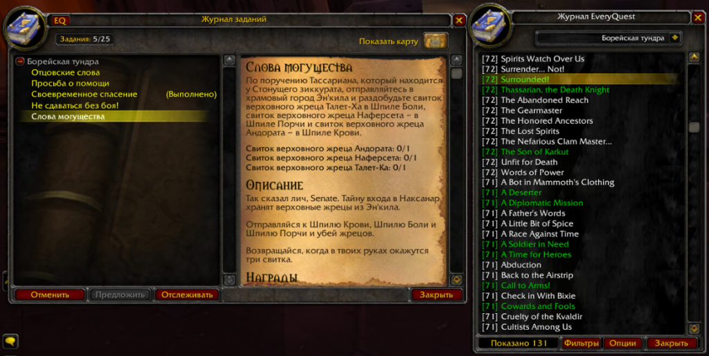 Аддон EveryQuest 3.3.5 — позволяет отслеживать завершённые и незавершённые квесты, а также показывает расположение NPC, у которых можно взять новые задания.