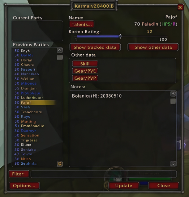 Аддон Karma 3.3.5 — позволяющий следить за игроками, с которыми вы взаимодействуете в игре, чтобы запоминать, были ли эти встречи положительными или отрицательными. Вы можете создавать заметки для каждого игрока, например: «Приятный человек», «Отлично помог с квестом» или «Неадекват». Также удобно просматривать историю прошлых взаимодействий и быстро находить нужную информацию.