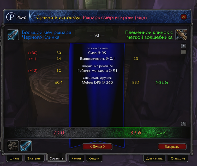 Аддон Pawn 3.3.5 — нужен для оценки экипировки, который помогает игрокам выбирать самые полезные предметы для своего персонажа. Основная задача аддона — быстро и наглядно показывать, насколько новый предмет подходит по сравнению с текущим, анализируя характеристики и заданные приоритеты.