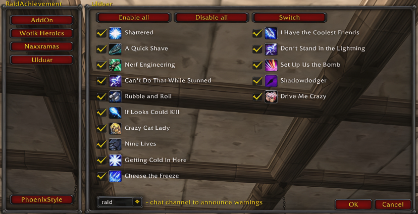Аддон RaidAchievement 3.3.5 — аддон для World of Warcraft 3.3.5, созданный для рейд‑лидеров и игроков, стремящихся контролировать выполнение достижений во время рейдов и подземелий. Аддон автоматически проверяет условия получения достижений и мгновенно оповещает о любом их нарушении.