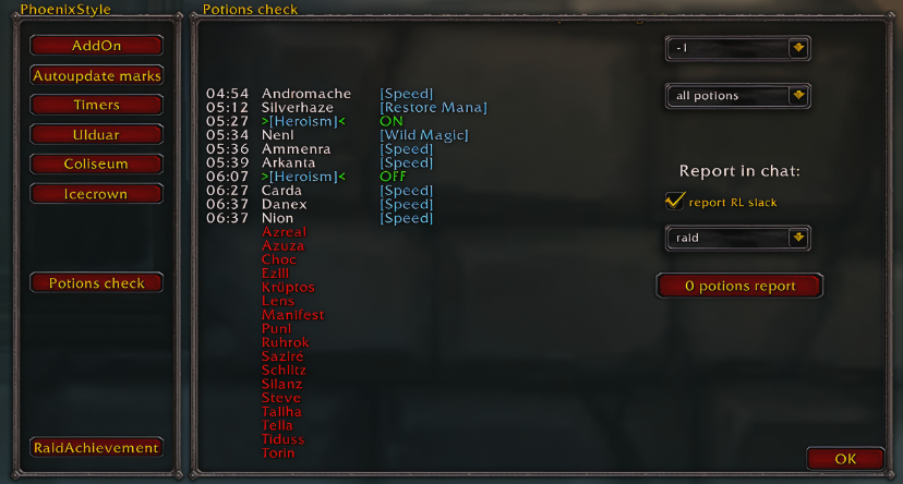 - Контроль ресурсов: Аддон анализирует наличие ключевых ресурсов у игроков: уровень здоровья, маны, наличие зелий, баффов, еды и других важных параметров. Это позволяет избежать неполной подготовки к бою;