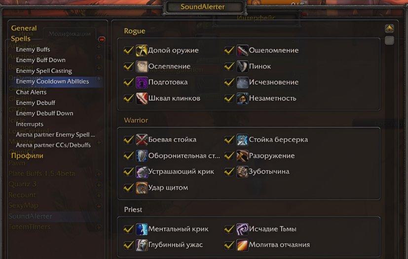 • Звуковые оповещения о ключевых скиллах: Polymorph, Kick, Fear, Ice Block, PvP Trinket и др.;