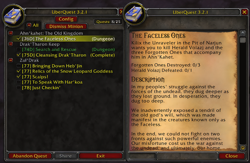 Аддон UberQuest 3.3.5 — этот аддон значительно улучшающий систему отслеживания квестов и помогающий игрокам эффективно управлять заданиями. Он предоставляет широкий набор полезных функций, которые позволяют игроку сосредоточиться на выполнении квестов и сократить время, необходимое на их поиск.