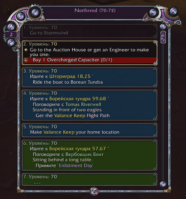 Аддон помогает выбирать оптимальные маршруты выполнения заданий, а также дает полезные советы, например, когда стоит заранее приобрести определённые предметы для успешного прохождения квестов.