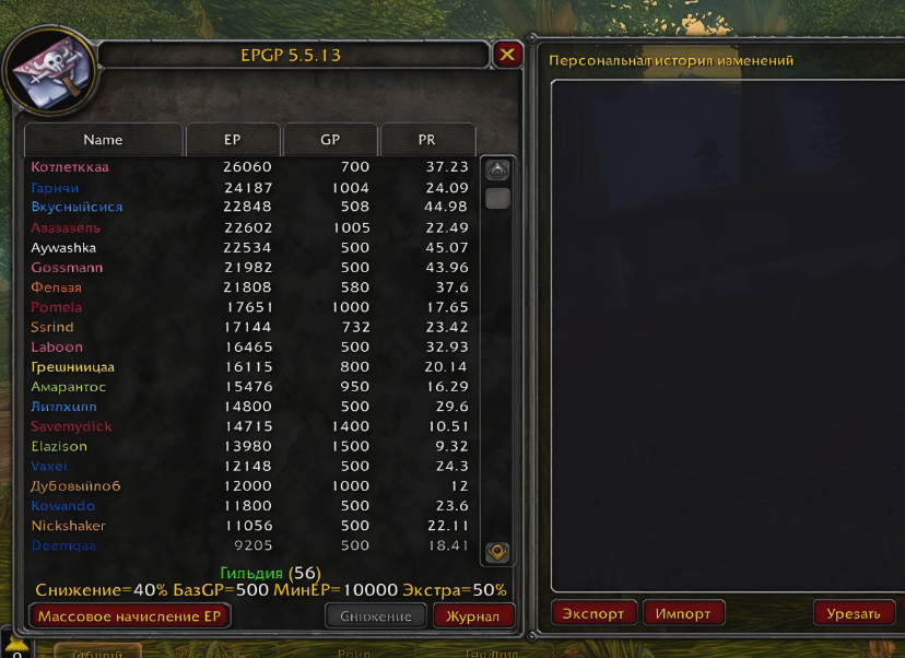 - EPGP — отображает очки EP, GP и приоритеты у всех участников гильдии, хранит информацию локально.