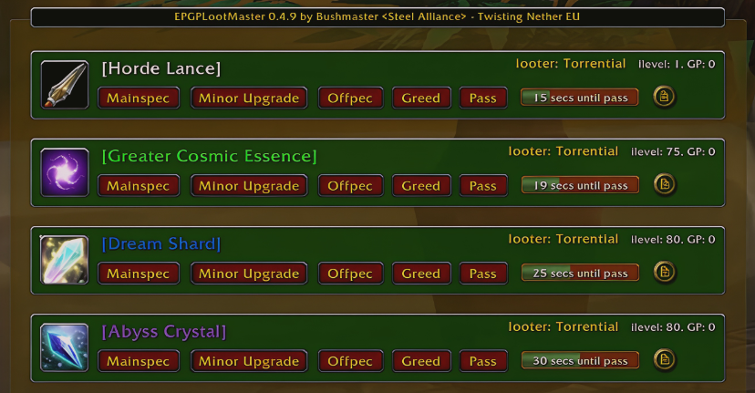 - EPGP Lootmaster — организует быстрый и прозрачный процесс раздачи лута во время рейда: лут распределяется автоматически на основе приоритетов.