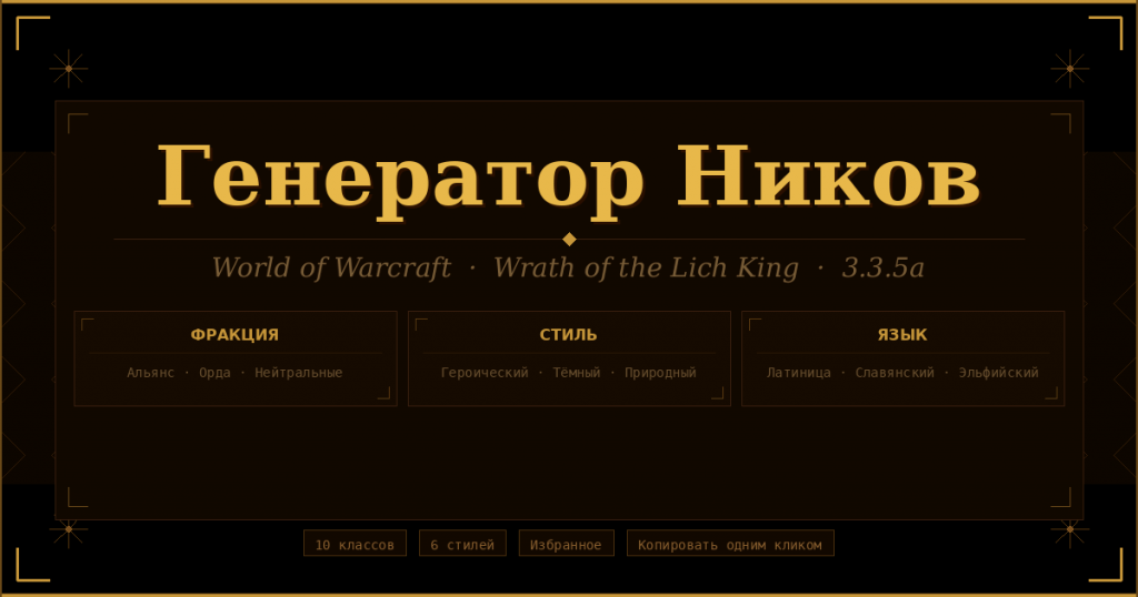 Генератор ников для WoW работает прямо на странице — никаких регистраций, ничего лишнего. Просто выбирайте настройки и смотрите результат.