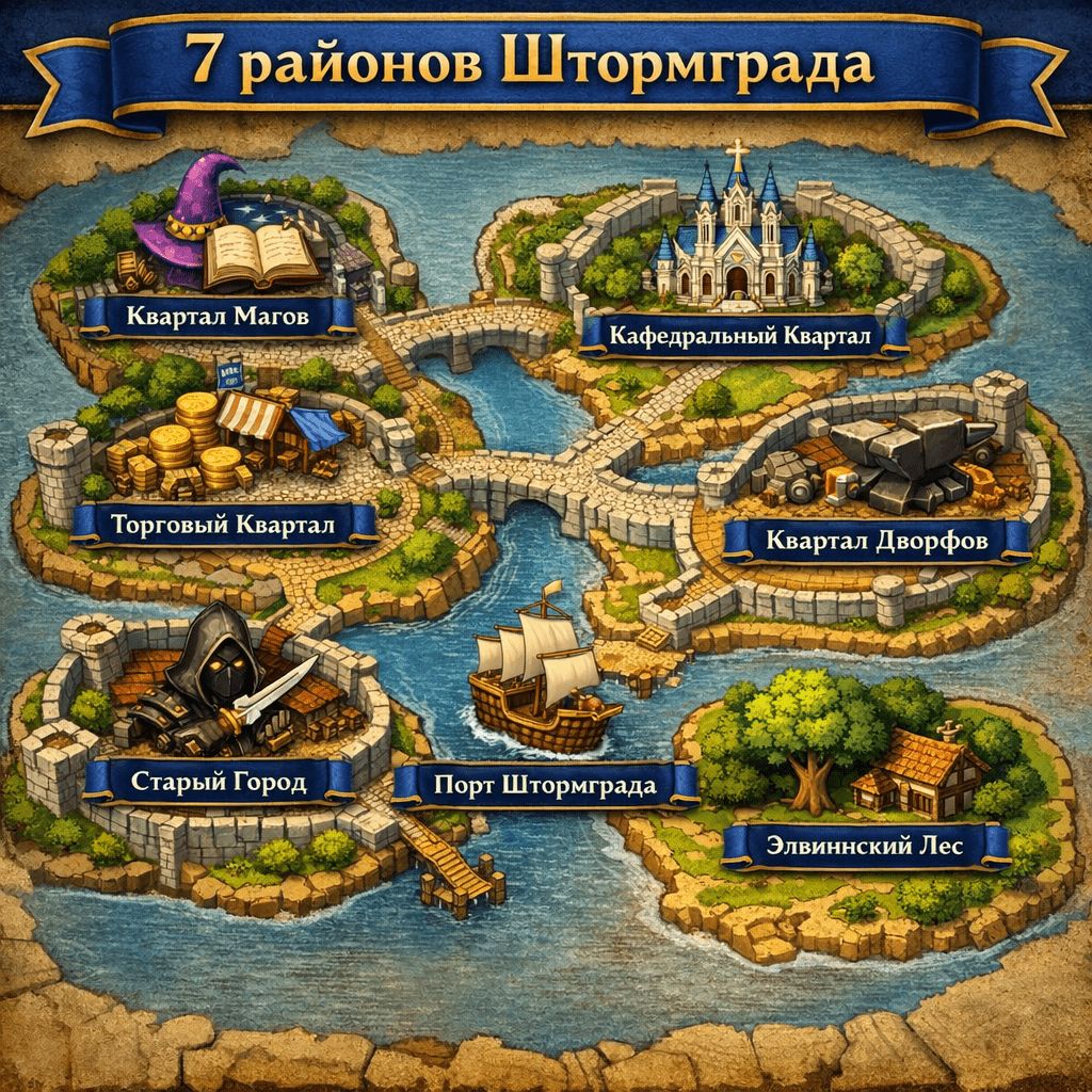 Штормград разделен на восемь уникальных районов, каждый из которых имеет свою атмосферу, НИПов и функции. Давайте детально разберем каждый из них.