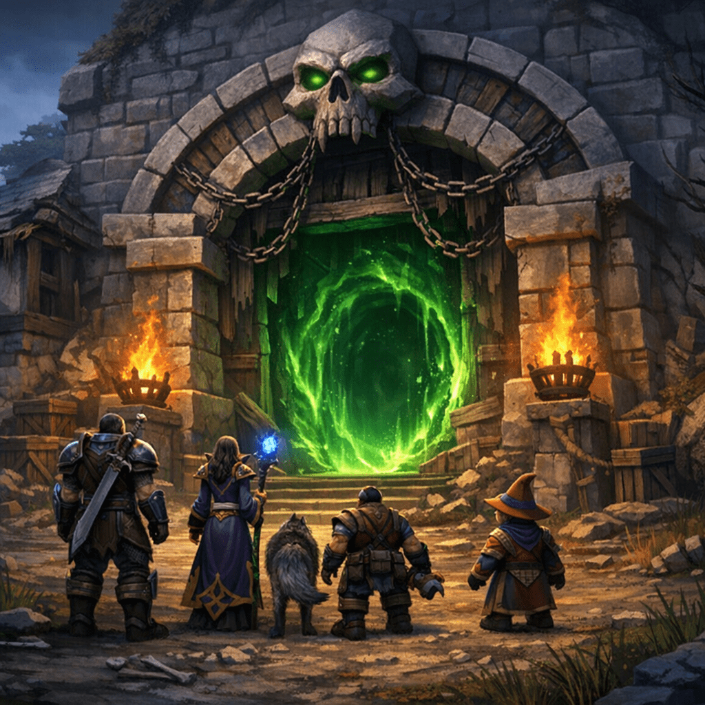 Вход в подземелье выглядит как портал в стене (координаты: 50.5, 66.3). Рядом с ним стоит Камень призыва для призыва членов группы.